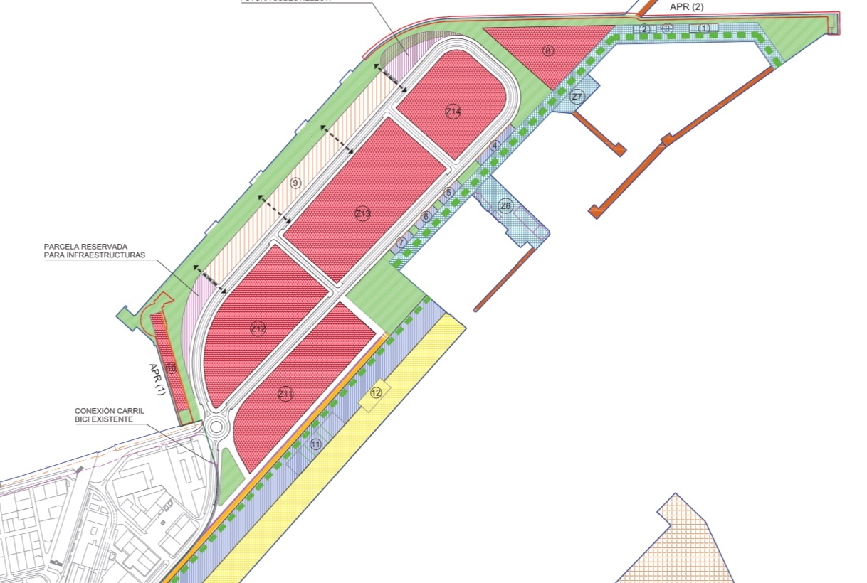 En el muelle Reina Sofía, donde se ubica la actual terminal de contenedores pendiente de traslado, se prevén usos comerciales, de ocio, oficinas y hotelero, incorporando zonas verdes y espacios públicos, es donde están la célebres Zonas Z, que se ven en la imágen de la derecha en rosa.