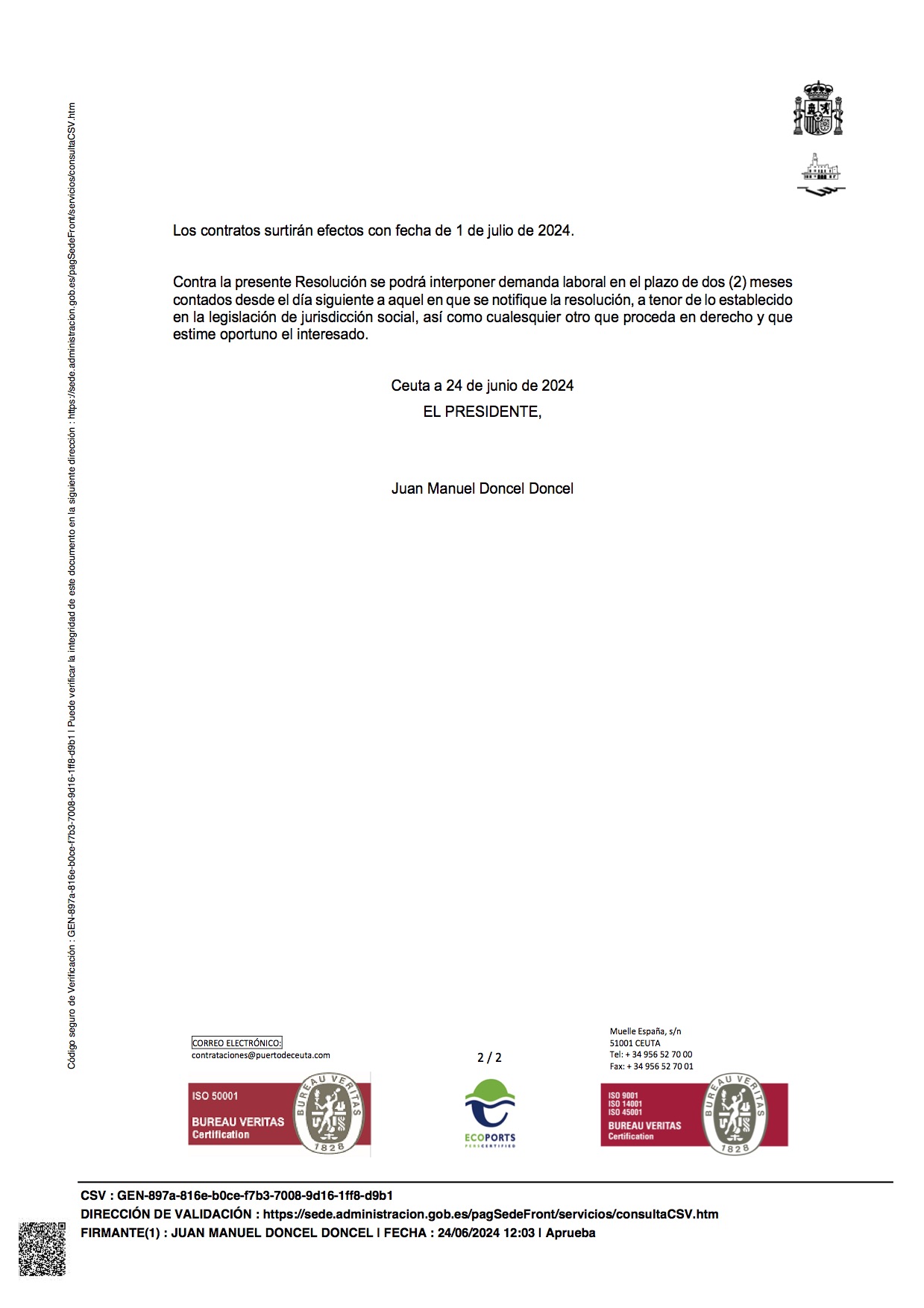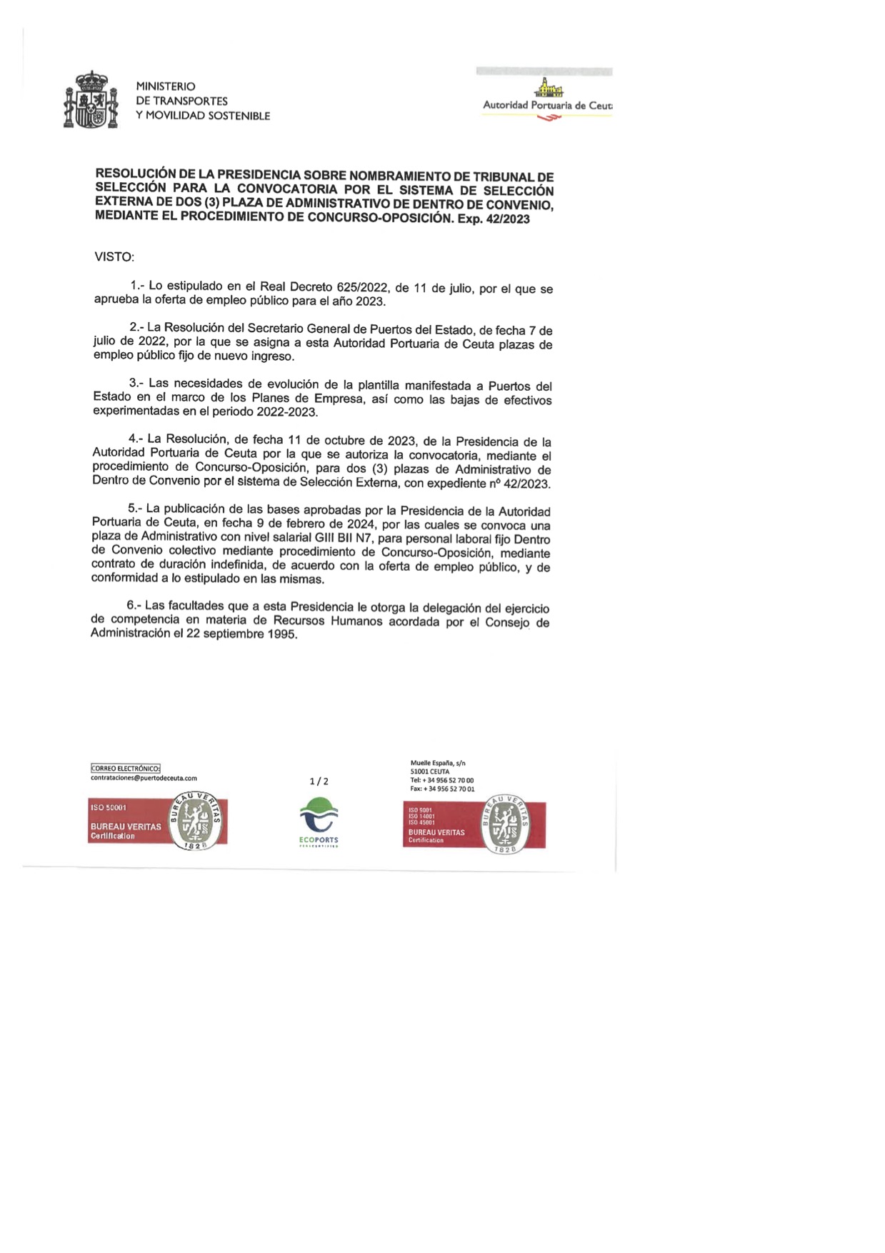 2.- La Resolución del Secretario General de Puertos del Estado, de fecha 7 de julio de 2022, por la que se asigna a esta Autoridad Portuaria de Ceuta plazas de empleo público fijo de nuevo ingreso.