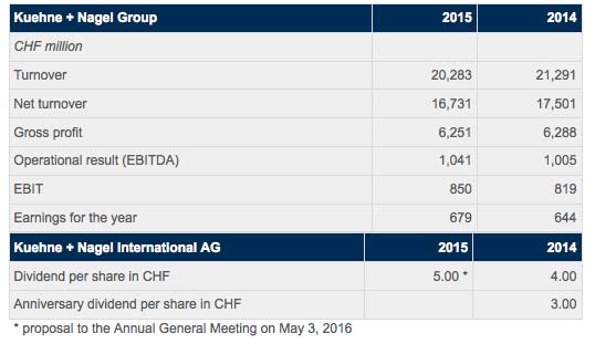 El año 2015 ha sido muy exitoso para Kuehne + Nagel Group. La rentabilidad aumentó dando lugar a un nuevo récord de beneficios.