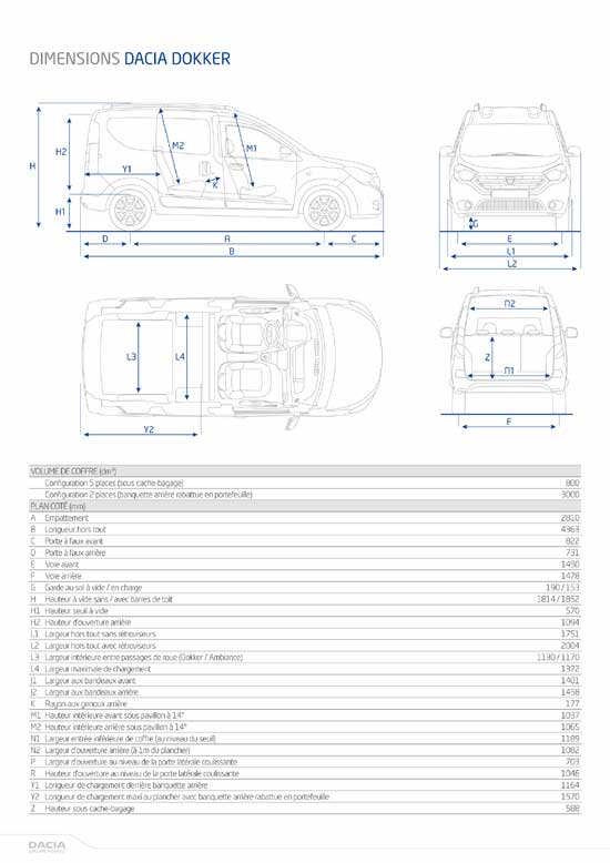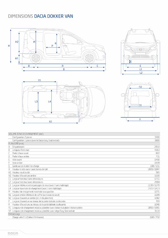 Gracias a sus dimensiones (longitud: 4,36 m, anchura de 1,75 m y altura de 1,81 m), Dacia Dokker van ofrece un generoso volumen de carga de 3,3 m3 y una longitud de carga de 1,9 m.