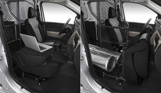 En la gama española, el habitáculo está separado del espacio de carga a través de una mampara maciza acristalada o una mampara pivotante de rejilla (en opción). Esta última permite abatir el asiento del pasajero (opción Dacia Easy Seat) para aumentar el volumen útil a la vez que se conserva la protección del conductor. Dacia Dokker Van se beneficia de serie de una puerta lateral corredera amplia. Con un diseño muy robusto, se abre sin esfuerzo gracias a una empuñadura de grandes dimensiones y facilitan el acceso a la zona de carga.