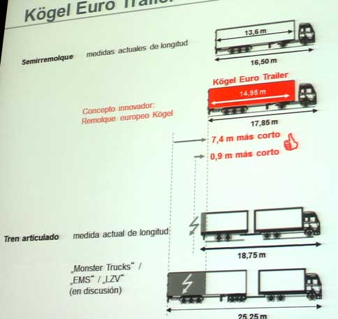 Kögel ha solucionado este problema con su Euro Trailer, su semirremolque con una longitud 1,30 metros mayor. El Euro Trailer se presentó por primera vez en el año 2005. Desde diciembre de 2005 se está desarrollando con éxito un ensayo piloto en Alemania. El Instituto de Automovilismo certifica en el dictamen adjunto que el Euro Trailer de Kögel muestra una excelente aptitud práctica y un alto estándar de seguridad vial.